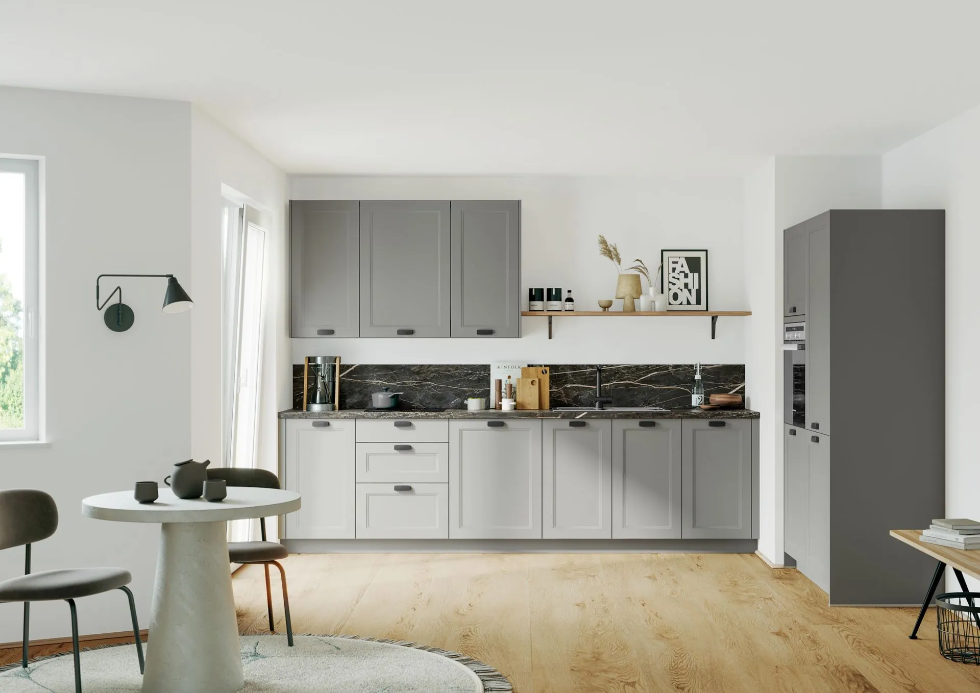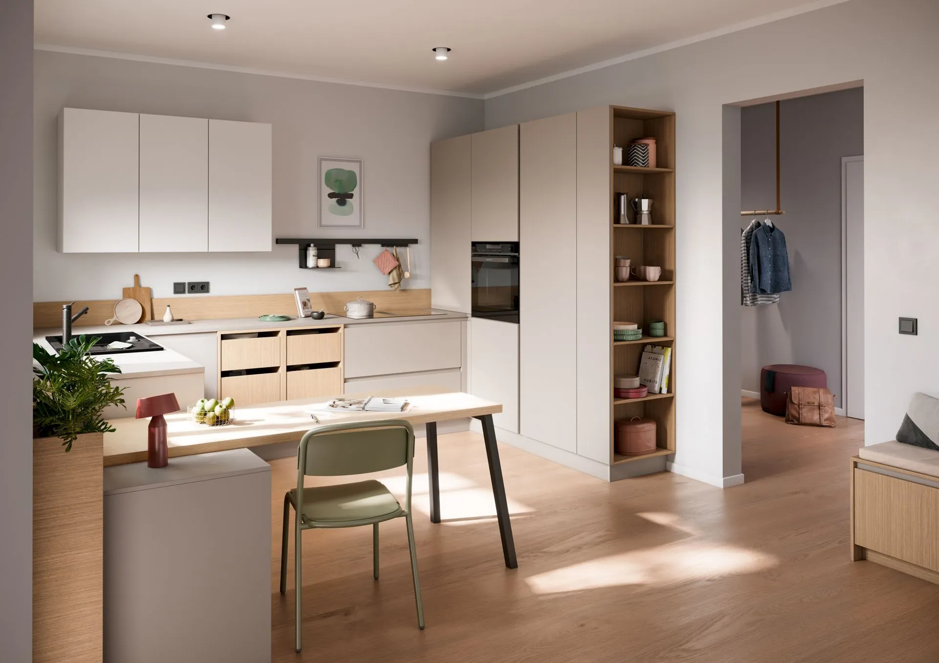 Trotz ihrer kompakten Bauweise muss die Küchenzeile keine Kompromisse bei der Ausstattung machen: Moderne Elektrogeräte, hochwertige Fronten und durchdachte Stauraumlösungen wie Vollauszüge und Oberschränke sorgen für eine voll funktionsfähige Küche. Darüber hinaus ist die Küchenzeile flexibel erweiterbar – etwa mit einer freistehenden Kücheninsel oder einem Esstisch als zusätzliche Arbeitsfläche.